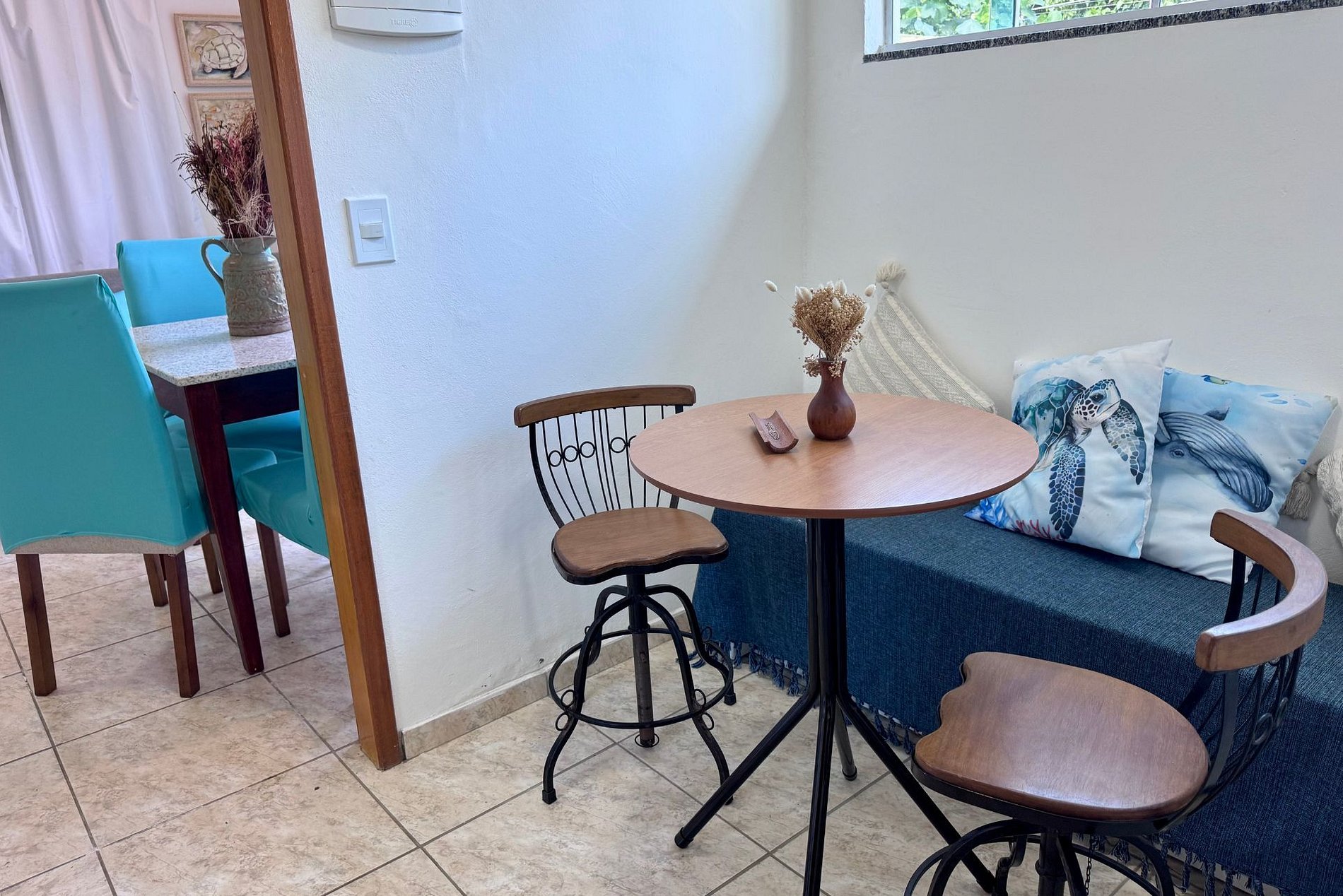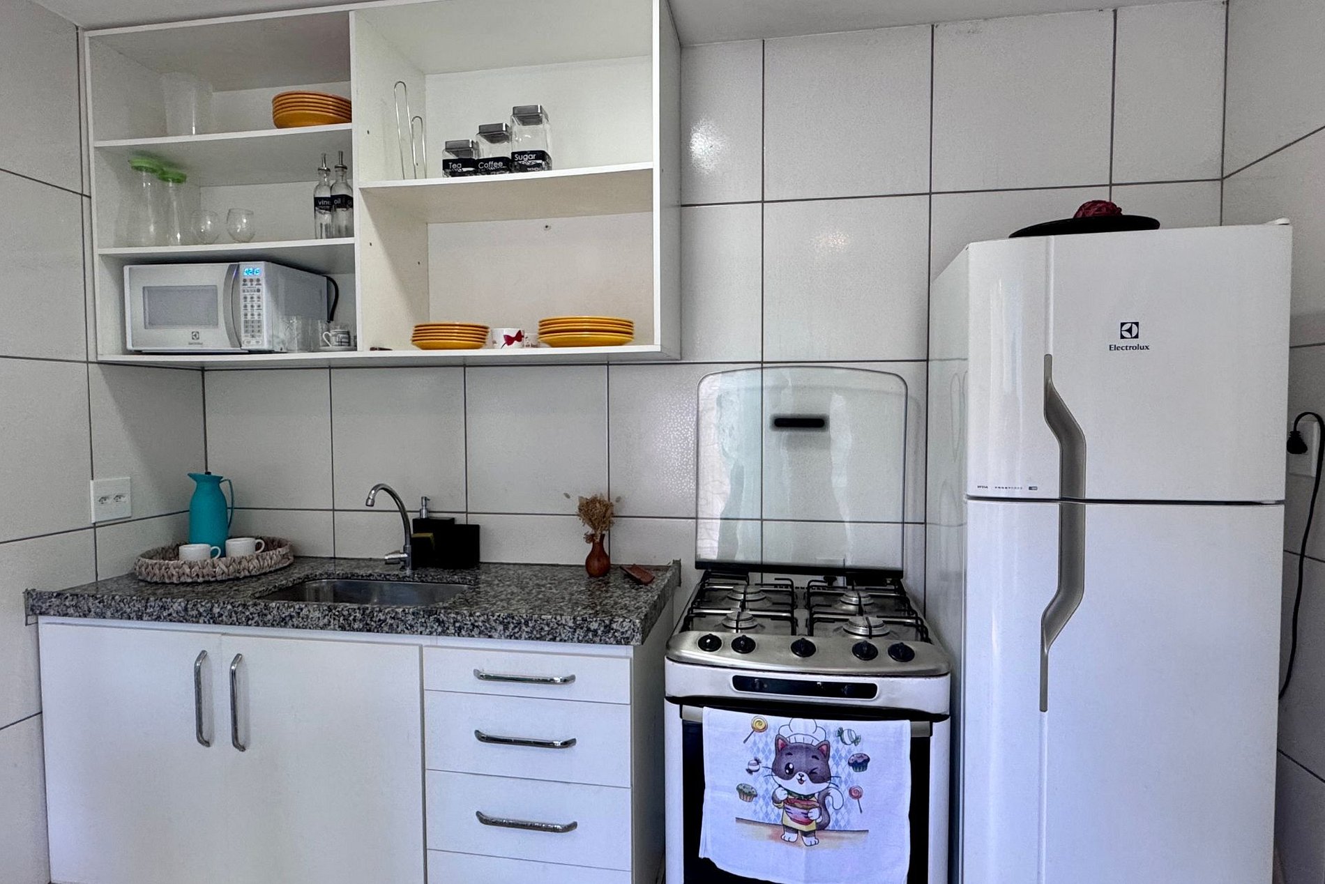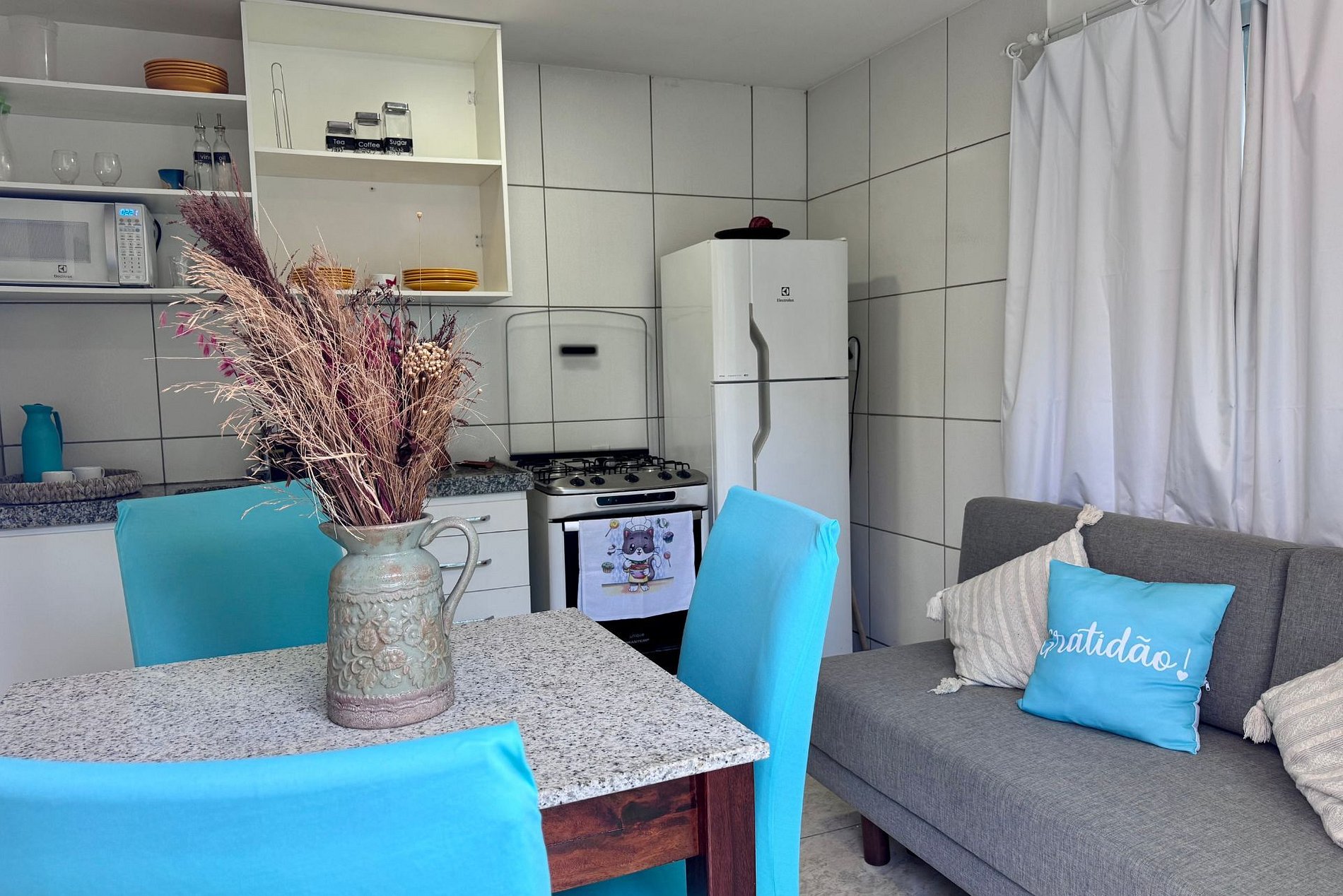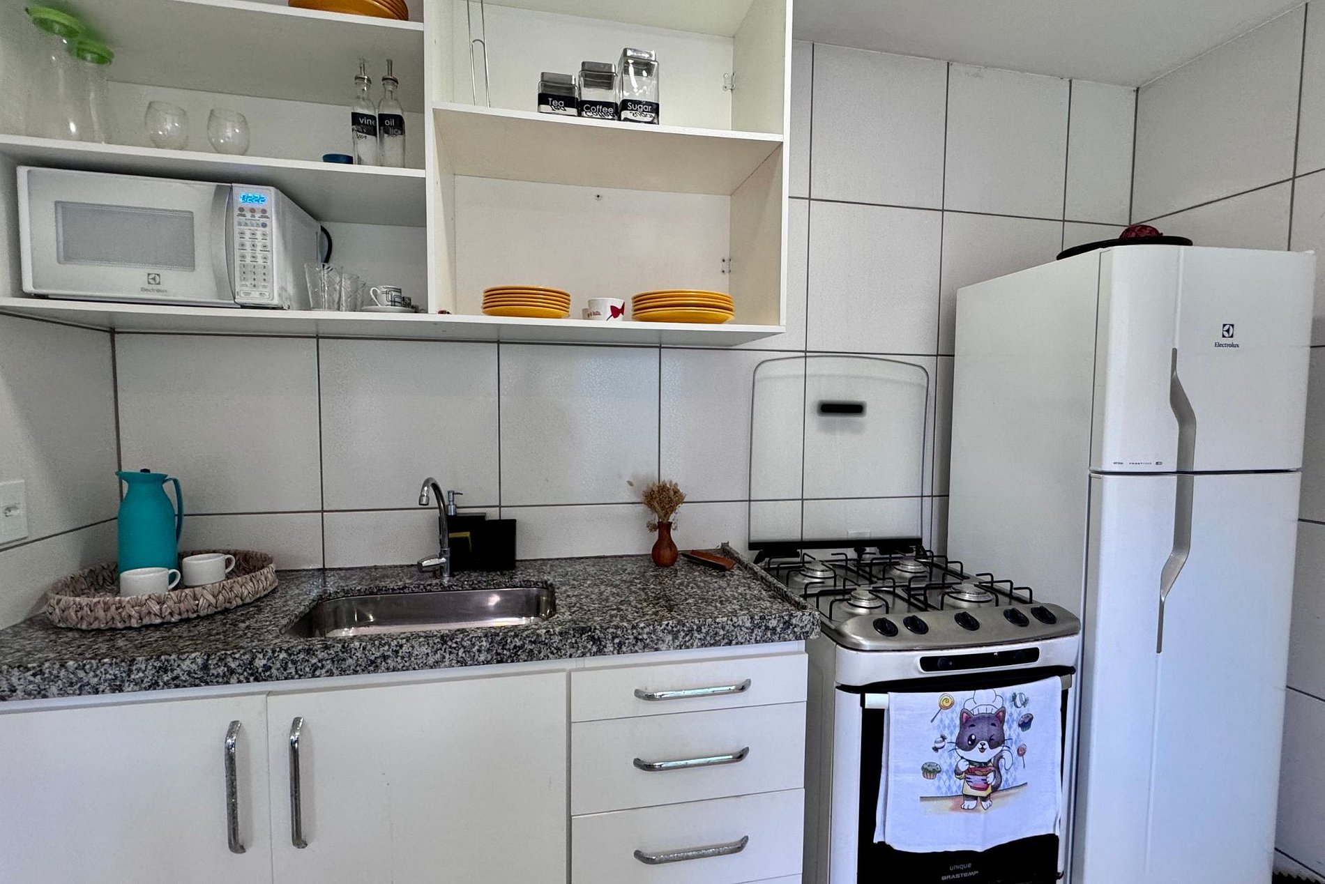 Apartamento aconchegante com quarto equipado com cama king-size, TV e guarda-roupas. Dispõe de banheiro, cozinha completa, sofá-cama e uma charmosa salinha que conecta e ao mesmo tempo separa os dois ambientes, garantindo conforto e privacidade.