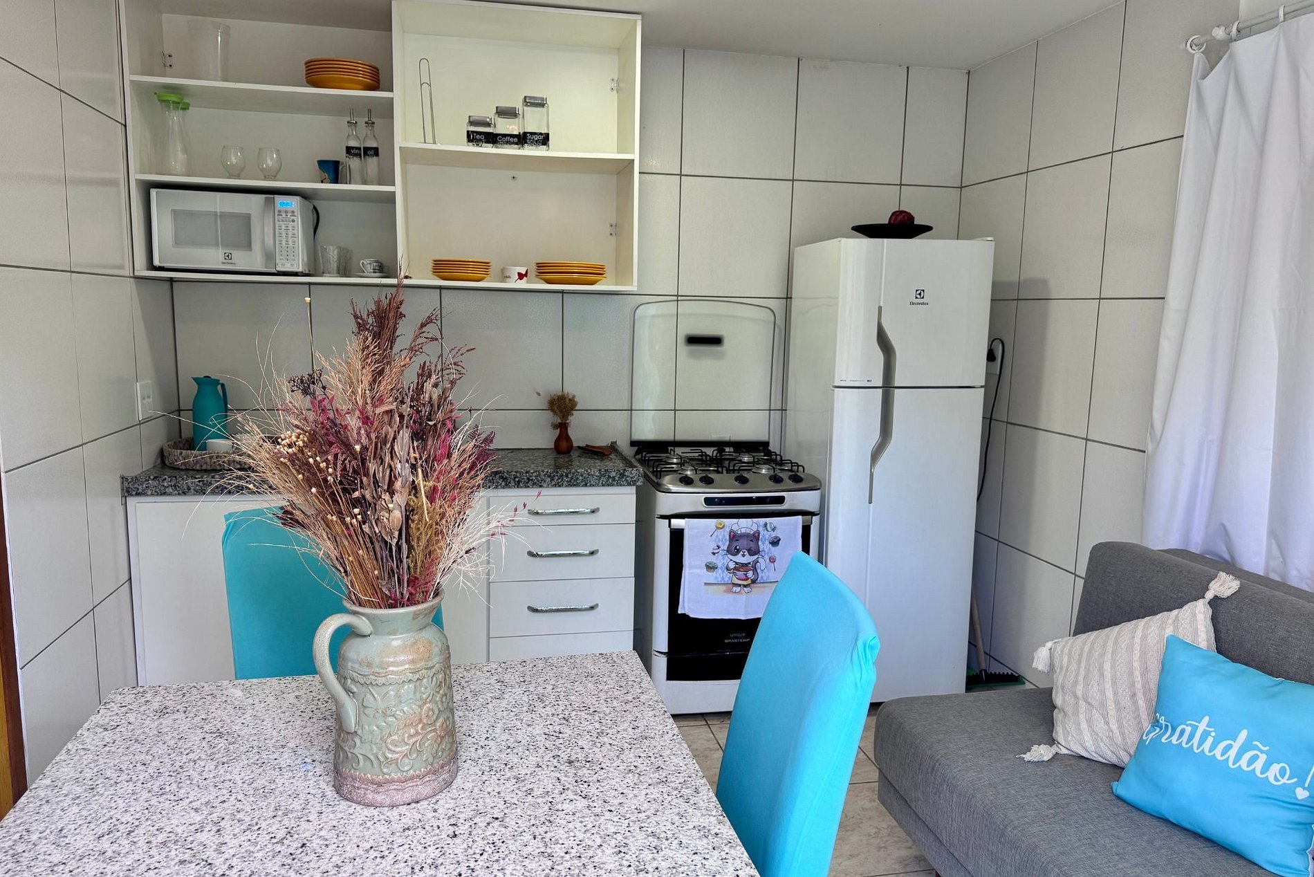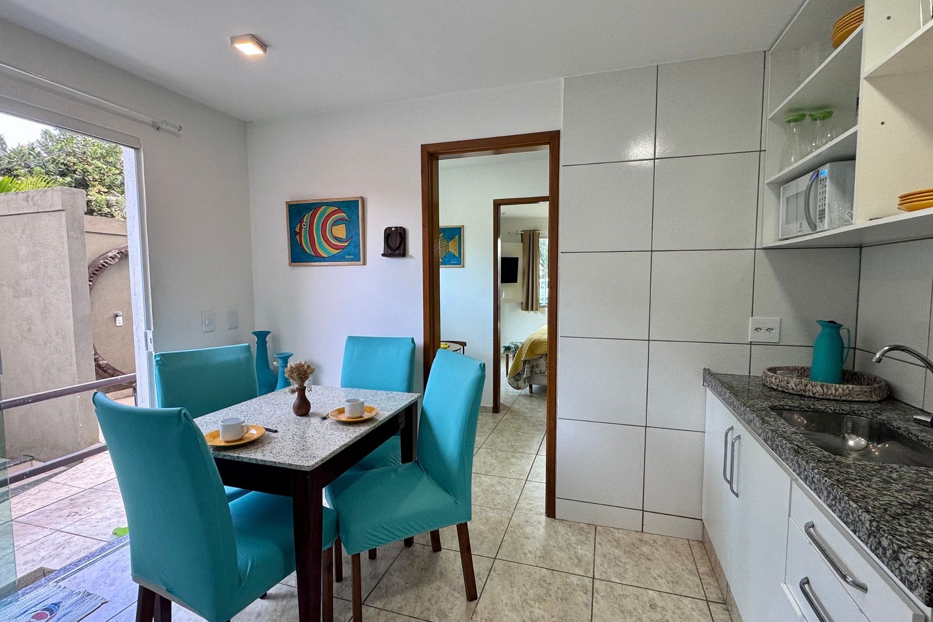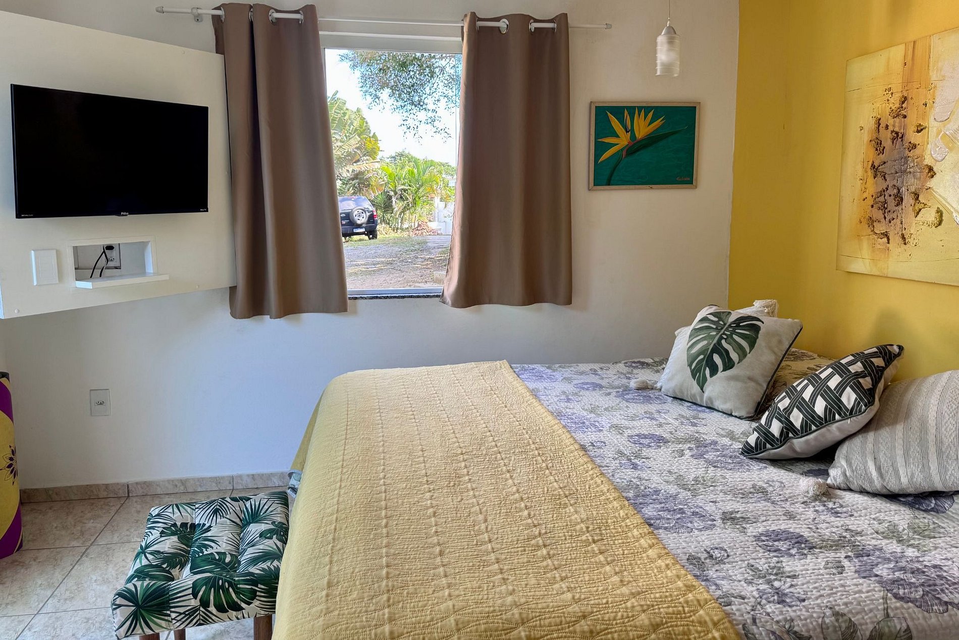 Apartamento aconchegante com quarto equipado com cama king-size, TV e guarda-roupas. Dispõe de banheiro, cozinha completa, sofá-cama e uma charmosa salinha que conecta e ao mesmo tempo separa os dois ambientes, garantindo conforto e privacidade.