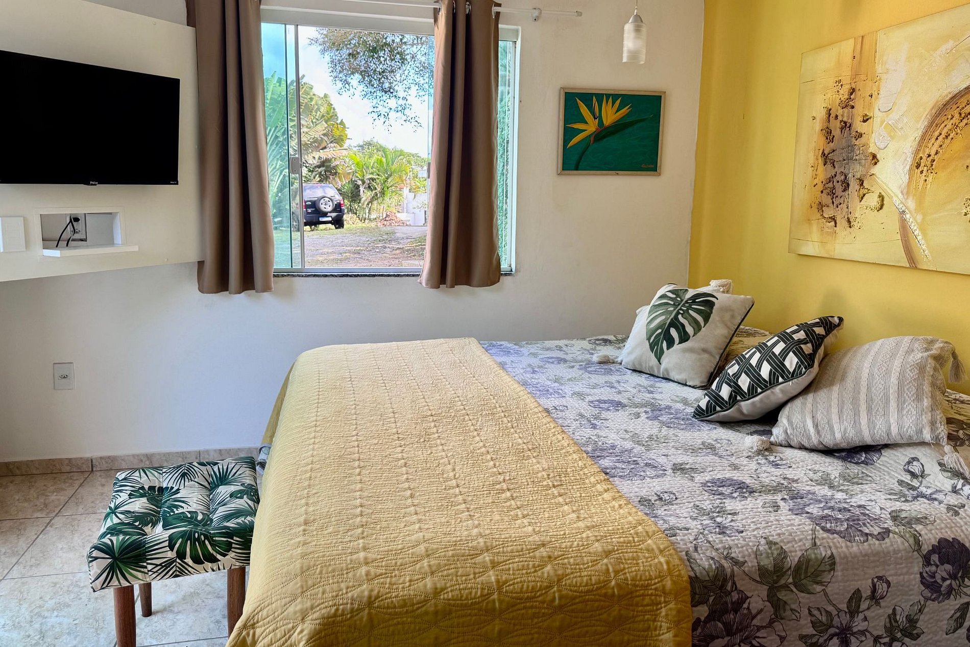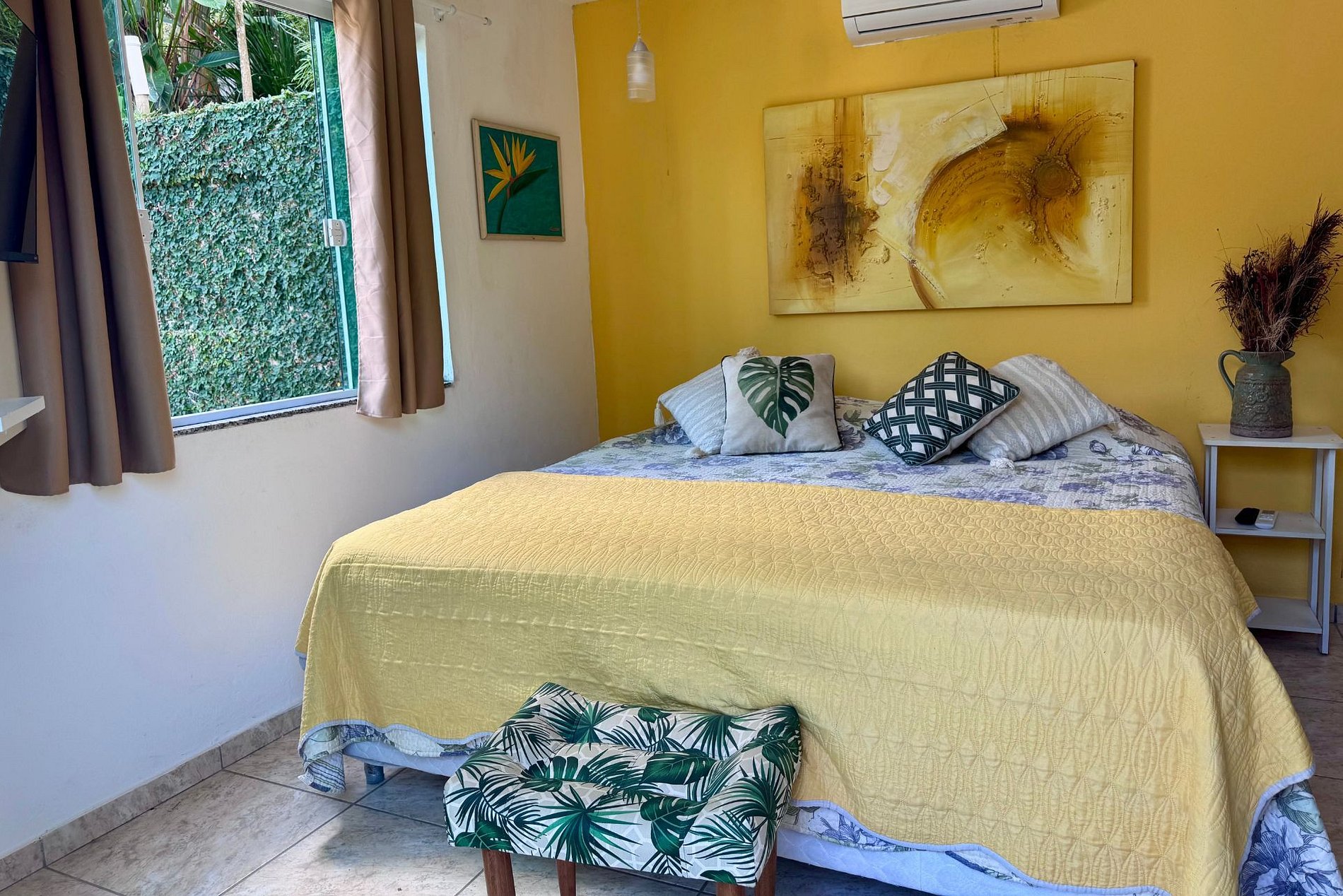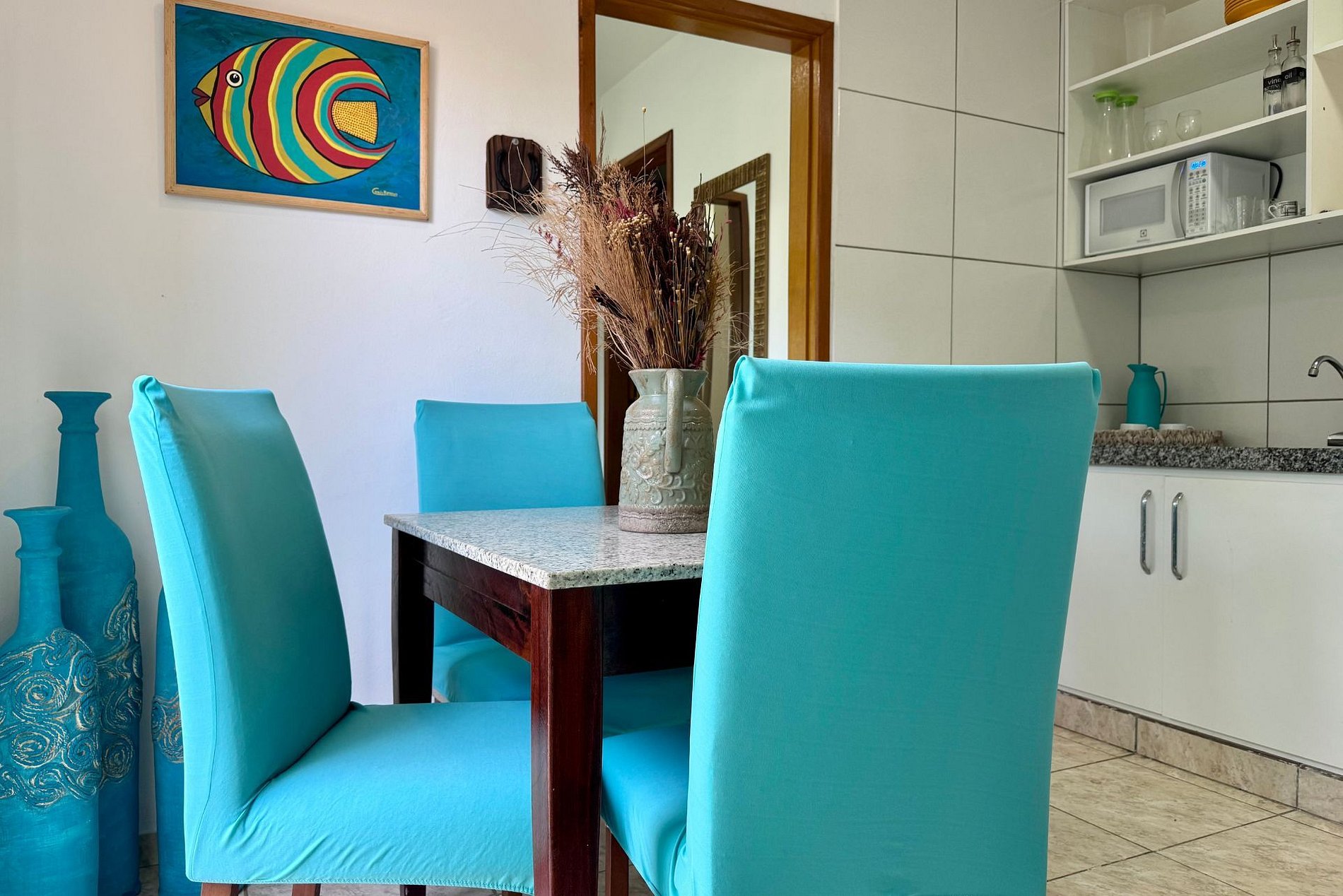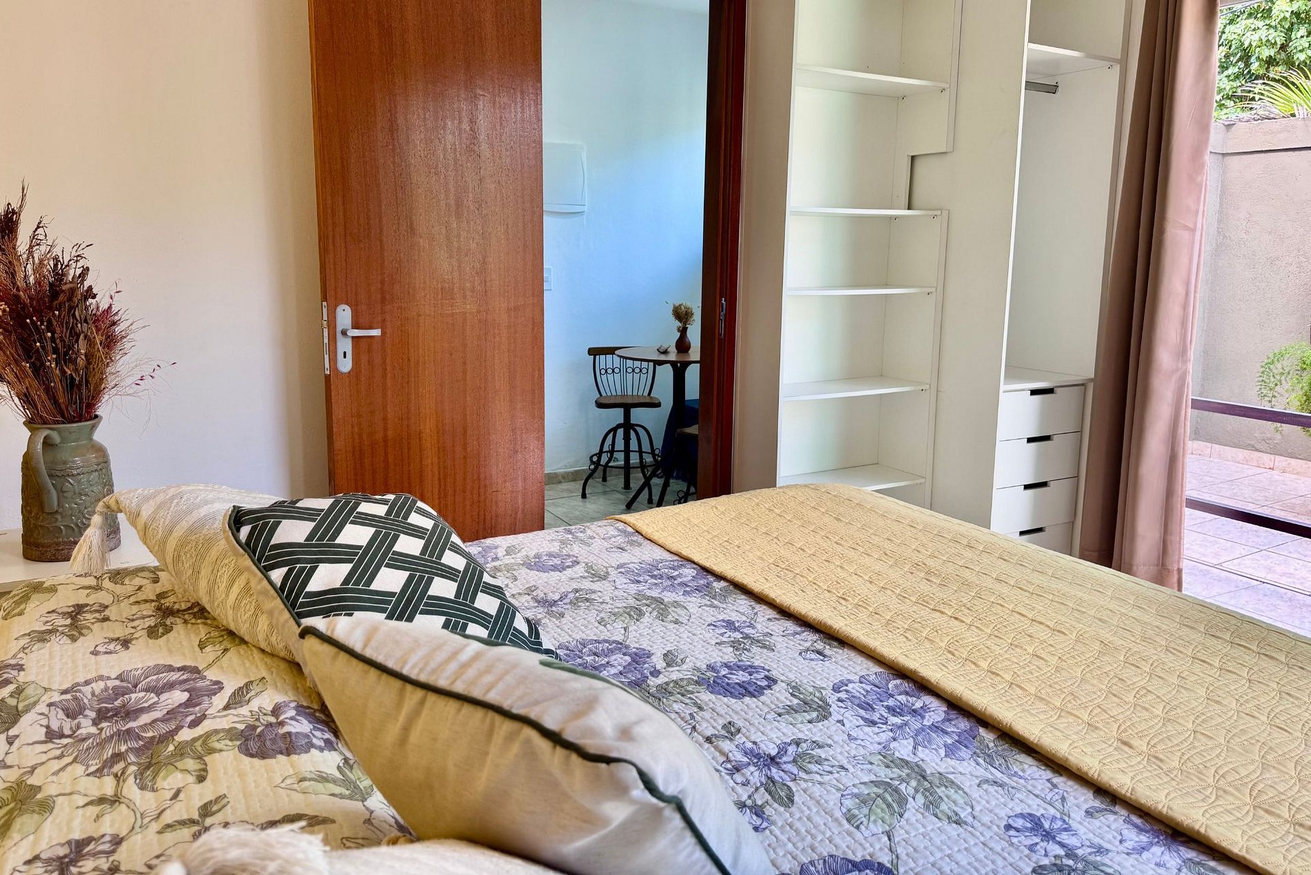 Apartamento aconchegante com quarto equipado com cama king-size, TV e guarda-roupas. Dispõe de banheiro, cozinha completa, sofá-cama e uma charmosa salinha que conecta e ao mesmo tempo separa os dois ambientes, garantindo conforto e privacidade.